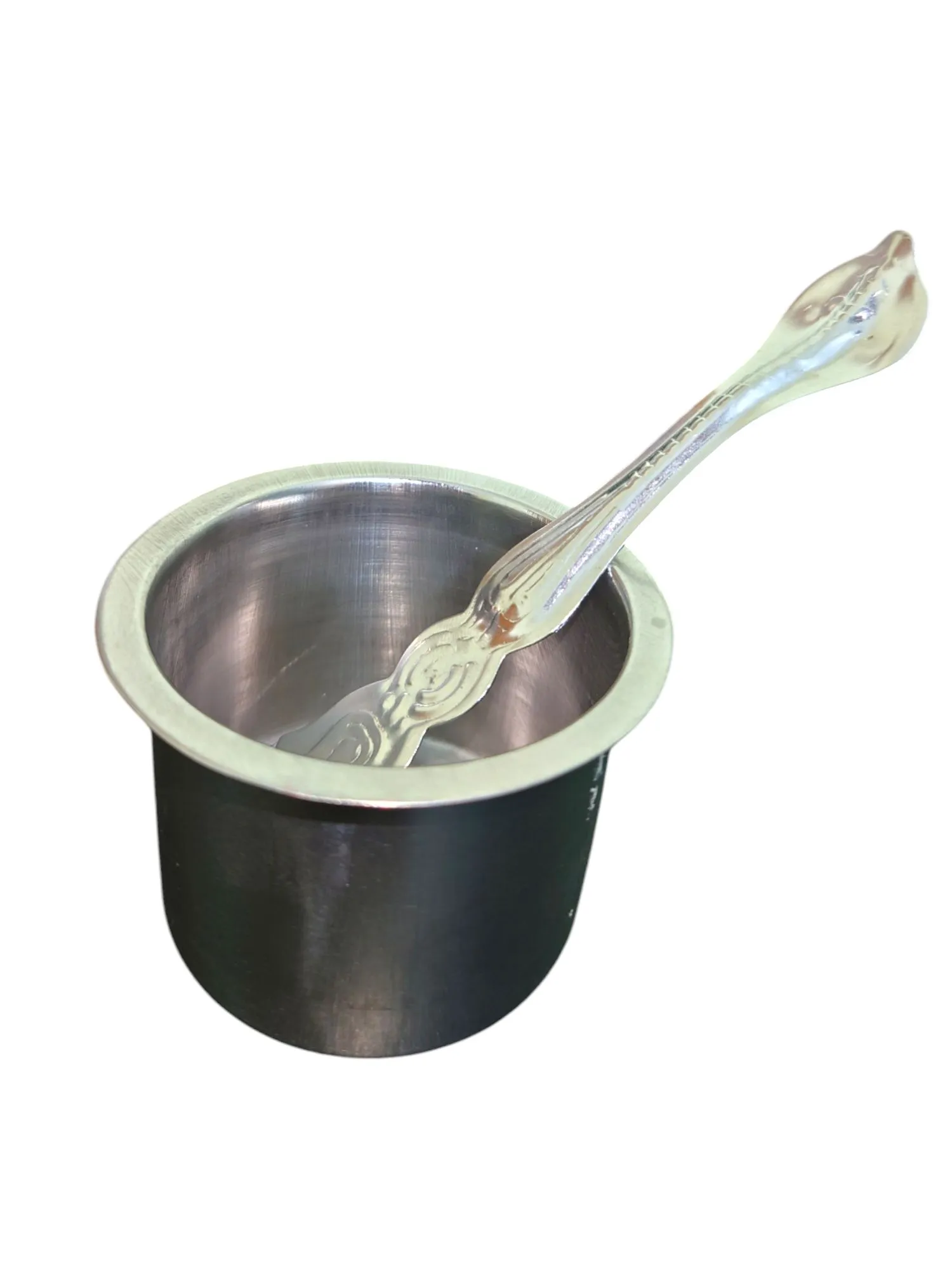 A steel আচমন পাত্ৰ is a small vessel made of stainless steel, used in Hindu rituals for āchamana (ritual purification by sipping water).